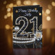 Celebre o marco de um aniversário de 21 anos com muito estilo ultra-chique com este cartão de cumprimentos personalizado e luxuoso. O design apresenta o grande número "21" exibido de forma proeminente, ricamente decorado com gemas facetadas pretas cintilantes e rodeado por acentos de diamantes brilhantes brancos sobre um fundo preto ousado. Este tema elegante preto e dourado comunica instantaneamente glamour e sofisticação de alta qualidade, perfeito para qualquer pessoa que complete 21 anos.