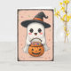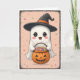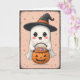 Um fantasma irresistível e fofo num chapéu de bruxa segurando uma abóbora! Este cartão de Dia das Bruxas ao estilo pastel é perfeito para amantes fantasmas que apreciam vibrações doces e assustadoras.