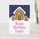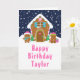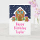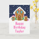 Este cartão de aniversário fofo e festivo pode ser personalizado com um nome ou título como filha, neta, sobrinha, amiga, etc. A design apresenta uma bela casa de pão de gengibre decorada com doce de Natal rosa e verde. Além disso, são adoráveis gengibres com presentes, vestidos com chapéus de Papai Noel e cachecol. Ao fundo está um céu azul marinho de inverno com flocos de neve em queda elegante. O texto é corajoso e festivo. Isto é perfeito para o Natal e o feriado de inverno.