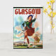 Great travel poster for Glasgow Scotland featuring a Scots lassie in a kilt dancing to a bagpiper.