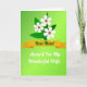 This greeting card features a smooth green gradient background that shifts from bright lime to deeper emerald, setting a fresh, gentle mood. Near the top, three white stylized flowers with small warm-brown centers sit among dark green leaves, leaning close together like a quiet sign of affection ❤️. Across the middle, a golden-ochre ribbon banner stretches horizontally, adding a warm contrast to the cool greens. Centered on the banner is a short line of deep green lettering, placed neatly to stand out against the gold. Below the ribbon, a second line of white flowing lettering appears, spaced with room to breathe and giving the layout a soft, intimate feel 🌼. The flowers and foliage frame the words without crowding them, guiding your eyes from the blossoms down to the message. Subtle highlights in the background add a light glow that makes the greens feel layered rather than flat. The three blossoms are clustered in the upper section, with their petals outlined in white against the deep green leaves.