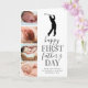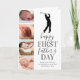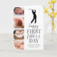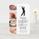 Cartão do dia dos pais com novo pai fofo apresentando um fundo branco simplista que pode ser alterado para qualquer cor, uma colagem de 4 fotos do seu bebê, uma silhueta de golfista, a frase "feliz primeiro dia dos pais" e uma legenda de pai que é facilmente personalizada.