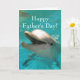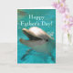 Esta design mostra uma foto de um golfinho sorridente em águas aqua. O cartão diz "Dia de os pais Feliz" no cobrir. O texto externo e a saudação de dentro são totalmente personalizáveis.