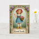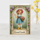 This card shows a sweet young girl standing in a sculpted archway, her blonde curls peeking out beneath a wide-brimmed pink hat as she looks forward with a gentle, friendly gaze 💚. She wears a sky-blue dress with a lace collar and a small brown bow, and her mustard-yellow boots add a sunny touch near the bottom of the scene. Tucked in her arm is a woven basket brimming with pink hydrangeas, like a thoughtful gift from a close friend. Around the arch, purple blossoms and winding green vines curl and climb, framing her like a garden doorway ☘️. The background sits in soft blue-green tones with warm, diffused light that makes her rosy cheeks and bright blue eyes stand out. Near the base, a simple pedestal carries the words “Good Luck” in dark lettering centered on the front. One of her hands is lifted slightly as if mid-wave, inviting you closer while the flowers spill over the basket’s rim in rounded pink clusters.