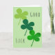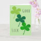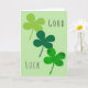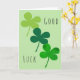 Three shamrocks in different green shades. Good luck for your family, friends and others. You can change the Good luck text if you want. Clovers with four leaves for the luck. The background is green but you can change it.