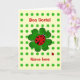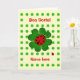Wish someone "Boa Sote!" = "Good Luck!" in Portuguese, and personalize the card with their name. The design is of a stylized ladybug on a large four-leafed lucky clover, with more clover shapes forming a green patterned background. Another tiny ladybug is hiding in the pattern, and inside there is also a ladybug.