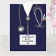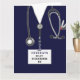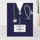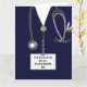 Cartão de formatura de enfermeiro com esfregões de hospital azul-marinho, estetoscópio e canivete suíço. Editar texto para adicionar o nome da enfermeira.