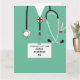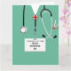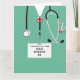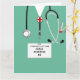 Modelo de cartão de formatura de enfermagem criativa com esfregões verdes em hospital. Para personalizar o texto de edição para adicionar o nome da sua enfermeira, assistente médico ou médico favorito.