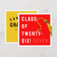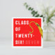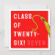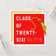 Cartão de graduação criativo para a Classe de formando '25 com boné vermelho formando, dourado e linha engraçada. Para personalizar editar texto para adicionar seu nome.