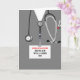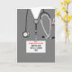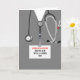 Modelo de cartão de graduação de enfermeira criativo com uniforme cinza de hospital. Edite o texto para adicionar nome e mensagem pessoal.