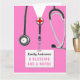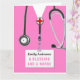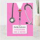 Cartões de formatura de enfermeiros com esfregões de hospital rosa e com temas médicos. Editar texto para adicionar nome.
