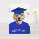 Cachorro golden retriever com uma camiseta azul e gorro de graduação usando óculos de aro preto sobre fundo de parede de tijolos de graduação parabéns. O texto é editável.