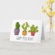 Cartão de aniversário com uma ilustração esbranquiçada com 3 cactos felizes sentados nos seus próprios potes de flores. Cada um deles tem suas próprias expressões únicas sorrindo e parecendo feliz.