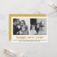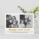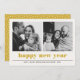 Cartão com fotos de feliz ano novo para tipografia gráfica contemporânea e mínima em negrito. A parte de trás da placa apresenta uma pop de coordenação de cores com um padrão de estrela de inverno.