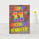 A frente deste vibrante, excitante e divertido design de cartões de saudação com tema de aniversário apresenta a mensagem "FELIZ 11 BIRTHDAY" com letras que têm um arco-íris multicolorido como um padrão de gradiente, e um nome editável colorido amarelo, sobre um fundo padrão de parede de tijolos. O olhar é inspirado pelo do grafite ou arte de rua desenhada em uma parede. O dentro apresenta uma mensagem de saudação de aniversário personalizável. Um cartão de cumprimentos de aniversário feliz, divertido e personalizado como este pode ser dado a alguém que comemora seu aniversário de 11. [~Z0000357]