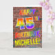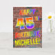 A frente deste empolgante, vibrante e surpreendente design de cartões de saudação com tema de aniversário apresenta a mensagem "HAPPY 45TH BIRTHDAY" com letras que têm um arco-íris multicolorido como um padrão de gradiente, e um nome personalizado amarelo, sobre um padrão de parede de tijolos. O estilo é inspirado pelo do grafite ou arte de rua desenhada em uma parede. O dentro apresenta uma mensagem de saudação de aniversário que pode ser personalizada. Um cartão de saudação de aniversário feliz, divertido e personalizado como este pode ser dado para comemorar o quarenta e cinco anos de alguém. [~Z0000357]