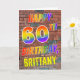 A frente desta divertida, atraente e vibrante design de cartões de saudação com tema de aniversário apresenta a mensagem "HAPPY 60TH BIRTHDAY" com letras que têm um arco-íris multicolorido como um padrão de gradiente, e um nome personalizado amarelo, num fundo padrão de parede de tijolos. O estilo é inspirado pelo do grafite ou arte de rua desenhada em uma parede. O dentro apresenta uma mensagem de saudação de aniversário que pode ser personalizada. Um bom, divertido e personalizável cartão de cumprimentos de aniversário como este pode ser dado a alguém que comemora seu sexagésimo aniversário. [~Z0000357]