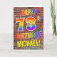 A frente desta divertida, excitante e vibrante design de cartões de saudação com tema de aniversário apresenta a mensagem "FELIZ 73RD BIRTHDAY" com letras que têm um arco-íris multicolorido como um padrão de gradiente, e um nome personalizável amarelo, num fundo padrão de parede de tijolos. A aparência é inspirada pelo grafite ou arte de rua desenhada em uma parede. O dentro apresenta uma mensagem de saudação de aniversário personalizável. Um cartão de saudação de aniversário feliz, divertido e editável como este poderia ser dado para celebrar o setenta e terceiro aniversário de alguém. [~Z0000357]