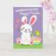 This card shows a white bunny with pink inner ears and paw pads, wearing a small pink bow on one ear, and its rosy cheeks and gentle smile suggest a sweet bond 🐰. The bunny sits low and centered on a bright green strip of ground, as if posing for a treasured springtime moment. To the bunny’s right is a basket with soft pastel stripes, filled with egg shapes in light spring colors that hint at a first seasonal celebration. Above the illustration, the word “GRANDDAUGHTER” appears in uppercase lettering, with “Happy 1st Easter” placed nearby in a lighter, flowing style. The lettering is set high on the lavender background, standing out clearly without crowding the scene. Small hearts float near the bunny’s head, adding a tender, affectionate note like a quiet message between loved ones 🌷. The background stays a calm lavender while the green ground forms a neat base line under the bunny and the basket.