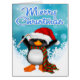 Envie a cumprimento grande esta época natalícia com este cartão sobre-feito sob medida pinguim do Feliz Natal (8,5" x11") que caracteriza um fundo decorativo de turquesa com neve e flocos de neve, um pinguim feliz que guardara um bastão de doces colorido que veste um chapéu do papai noel. O texto azul e branco decorativo é Feliz Natal. Cartão interno: caracteriza um fundo decorativo de turquesa com neve e flocos de neve. O texto customizável está desejando-lhe um Natal enchido com o amor. Customizável na parte externa e dentro, este cartão personalizado pinguim do Feliz Natal vem convenientemente com um envelope. Também disponível no tamanho do cartão de nota.