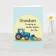 This card features a stylized blue farm vehicle parked on a rich green patch of ground, its large wheels and raised cabin drawn with simple shapes and smooth color fills. From the front scoop, a stream of small oval eggs pours out in sunny yellow, orange, purple, and watery blue, like a shared surprise spilling into the scene 🐰. The gentle tumble of eggs feels like a friendly gesture, as if the driver is happily gathering treats for someone special. A soft yellow arc sits near the top like a warm halo, setting a cozy backdrop for the message. Across that arc, the text reads “Grandson Scooping up Easter Wishes for You,” placed above the vehicle in a flowing, cursive-style font. The letters appear in a darker tone that stands out clearly against the yellow, while the rest of the background stays a calm light blue 🌷. The scoop is angled forward, and the eggs scatter in a curved trail from the bucket down toward the grass.