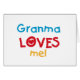 Granma me ama T-shirts, fatos-chave, cartas, bolsas e outros itens com design de texto azul, vermelho e amarelo.