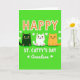 This card features a bright green background that nods to Ireland, with “HAPPY” placed at the top in orange letters edged by a wavy white outline 💚. Below the headline, three stylized cats sit side by side like close friends posing for a photo: a black cat with wide yellow eyes, a white cat with small green spots and green eyes, and a ginger cat with an easy, content look. Their calm faces and snug spacing give the scene a cozy, affectionate feel, like they’re sharing the moment together. Centered beneath the cats, “ST. CATTY’S DAY” appears in white, standing out sharply against the green field. Near the lower area, the word “Grandson” is written in a flowing black style, with tiny white shamrocks on either side to frame it ☘️. Small shamrocks are scattered around the design, adding little bursts of white that keep your eye moving. The overall look stays flat and graphic, with the orange “HAPPY,” white outlines, and the trio of cats clearly arranged in a neat vertical stack.