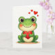 This greeting card shows a cute green frog sitting front and center on a plain white background, holding a shiny red heart close to its chest. The frog has big black eyes with small white highlights, a wide smile, and a soft pink blush on its cheeks that makes it look sweet and friendly. A few smaller red hearts float up above its head, like the love is bubbling over. The green body has gentle shading, and the red hearts look glossy, so the colors stand out nicely together. There’s no text on the card, so the frog and the hearts do all the talking. It feels perfect for romance, a crush, or even a kind note to a close friend ❤️