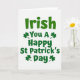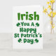 This card features a minimalist St. Patrick’s Day design with stacked emerald-green lettering centered on a bright white background. The main phrase reads “Irish You A Happy St Patrick’s Day,” arranged in a neat vertical layout that feels like a friendly toast shared between close friends 💚. “Irish” sits at the top in the largest letters, drawing the eye first, while the rest of the words step down beneath it in slightly smaller type. The rounded letter shapes keep the look soft and welcoming, like an easy smile across a table. Small shamrock icons ☘️ appear as simple accents around the wording, adding a gentle nod to tradition without crowding the space. The text stays centrally aligned with generous white space around it, giving the message room to breathe. A few stylized three-leaf clovers punctuate the composition near the lines of text, matching the same green tone against the white field.