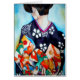 com design original da arte da pintura do watercolour da gueixa japonesa no quimono alaranjado detalhado intrincado azul escuro com fundo dos azul-céu. Brilhante e colorido, inspirado pela arte oriental e asiática, esta senhora bonita vem da região de Kyoto de Japão.