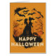 Das Bild zeigt zwei schattenhafte Figuren, eine Hexe mit Hut und ein weiteres Wesen, die sich im sanften Schein eines vollen Mondes gegenüberstehen. Umgeben von fliegenden Fledermäusen und kahlen Bäumen, strahlt die Szene eine mystische und unheimliche Atmosphäre aus. Der orange-braune Farbton verstärkt das Gefühl von Herbst und Halloween, während die Worte „HAPPY HALLOWEEN“ eine fröhliche Botschaft inmitten der düsteren Stimmung vermitteln.