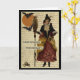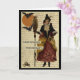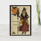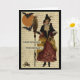 Cartão de Halloween com vassoura-de-bruxa, coruja, morcegos, lua de cheio, crânio e ossos cruzados, e texto antigo em segundo plano