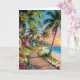A beautiful wedding anniversary card with a seaside tropical paradise illustration. Inside the card is a romantic poem. The front of the card is a beautiful illustration of a boardwalk along the coast, with palm trees with coconuts and strung fairy lights and small whimsical cottages.