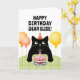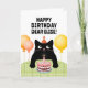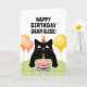 Happy Birthday card with custom name, little black cat, birthday cake and balloons.