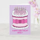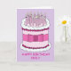 A simple illustration of a pink and white birthday cake with several lit candles on top and a pink bow tied around it. The image is set against a mauve coloured background and accompanied by the words 'Happy Birthday Emily'.