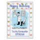 Cartoon óptico. Optician está lendo o pequeno impressão em uma parede de teste de olhos. Fundo de corações.Personalize com seus próprios detalhes e mensagem. Cartão de aniversário para um óptico.