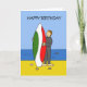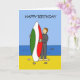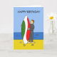 A cartoon of a young man holding a surfboard on a beach. The words 'Happy Birthday' accompany the image.