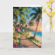 A beautiful birthday card with a seaside tropical paradise illustration. Inside the card is a sweet coastal themed poem. The front of the card is a beautiful illustration of a boardwalk along the coast, with palm trees with coconuts and strung fairy lights and small whimsical cottages.