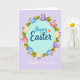 This card features a calm lavender background with a neat circular wreath that feels like a gentle embrace 🌷. In the center, a light blue circle holds the words “Happy Easter” in flowing purple lettering, with a tiny red heart tucked beside the phrase to add a sweet, affectionate touch. Around it, green leaves and small yellow and purple flowers form a ring, like a spring garland arranged for two people who care about each other. Tucked into the greenery are pastel egg shapes with marbled patterns in soft blue, pink, purple, and pale yellow, giving the design a tender, shared-celebration look 🐰. The eggs have subtle highlights that make them look slightly glossy against the matte background. Beneath the wreath, the text “Daughter & Son in Law” appears centered in small white flowing lettering. The final detail is the thin leafy stems and tiny blossoms evenly spaced around the circle, with the pastel eggs nestled between them.