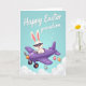 This greeting card features a long-eared white bunny flying a purple biplane high in a bright blue sky, with a cheerful grin that feels like it’s meant for someone special 🐰. The bunny wears shiny black aviator goggles, leaning forward as if eager to reach a loved one. Below the plane, soft white clouds stretch along the bottom edge, giving the scene a light, airy setting. Hanging beneath the lower wings are three pastel oval decorations with striped patterns, like little gifts being delivered with care 🌷. Across the upper area, the message “Happy Easter grandson” appears in white lettering that curves gently over the sky. The purple aircraft stands out against the blue background, with subtle shading that rounds out the wings and body. The bunny’s bright eyes and open smile add a friendly, affectionate energy, like a warm hello sent from far away. The striped ovals are shown in soft pastel tones, suspended neatly in a row under the wings.