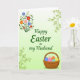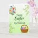 This card features a soft spring-green gradient background that sets a calm, affectionate tone, like a quiet moment shared between close partners 🐰. Centered on the front, the text reads “Happy Easter to my Husband” in flowing emerald lettering, sized large so it becomes the main focus. A flower cluster sits in the upper left, with red, orange, pink, and blue petals tucked among small green leaves, shaped a bit like an egg for a gentle seasonal nod 🌷. In the lower right, a woven basket adds a cozy, homey touch, as if it’s been set down for someone special to find. Inside the basket are six decorated egg shapes, each with zigzags and wavy lines in bright blue, fuchsia, tangerine, pale aqua, and sunny yellow. Curled green vines fill the upper right and lower left corners, loosely framing the message and guiding your eye back to the center. The lower-right basket is shaded with light brown crosshatching, and the eggs show tiny pattern details like thin stripes and small dots.
