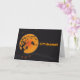 Black background with dead tree, sitting in the tree is a spooky owl! Under the tree are Halloween pumpkins! A witch flying on her broomstick highlights this spooky card that is great for a Halloween party invitation! Happy Halloween text can be edited! Text or photographs can be added to the inside of card! Pick up matching postage!