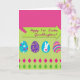 Designed with a lively split background, the top half is deep fuchsia while the bottom half is bright lime green, meeting in a crisp horizontal divide. A lime green arrow-shaped banner stretches across the middle, carrying a magenta message in flowing lettering placed neatly at its center. Four decorated egg shapes sit prominently in the middle, arranged like a small group sharing the spotlight with a friendly, togetherness feel 🐰. One egg is sky blue with tiny white blossoms and small fuchsia starbursts, while another is deep purple with thin golden curling lines that trail like gentle vines. A lighter blue egg features the white silhouette of a long-eared bunny with a small fuchsia bow, and beside it a pink egg shows tight concentric stripes in several colors, like rings wrapping around. Along the bottom edge, two rows of alternating fuchsia and lime green diamond shapes create a steady border that keeps the layout feeling organized yet festive 🌷. The overall look is brightly lit with smooth digital shading, and the banner sits just above the egg cluster while the diamond border runs straight across the base. The diamonds alternate fuchsia and lime green in a tidy pattern beneath the eggs.