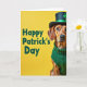 This greeting card shows a reddish-brown dachshund on the right side, looking straight out with a gentle, affectionate gaze that feels like it’s meant for a close friend. It wears a black top hat with an emerald green band and a neat four-leaf clover pinned to the front ☘️. A thick forest-green turtleneck sweater wraps its long neck and chest, with ribbed knit texture you can almost feel. The left half of the design is filled with a bright, sunlit yellow field that makes the dog’s warm fur and green clothing stand out 💚. Across that yellow area, the words “Happy Patrick’s Day” are set in dark green lettering, placed to the left of the dog for balance. Soft, even lighting highlights the shiny nose, bright eyes, and the folds of the sweater, giving the portrait a cozy, close-to-you feel. The yellow background stays plain and open, while the hat’s green band and clover add small, crisp details near the top right.