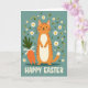 This card features a tall, stylized ginger cat standing upright in the center, with warm orange stripes, a creamy belly, and a gentle smile that feels like a friendly hello. Its rounded face and soft whiskers give it a tender, companionable look, as if it’s posing for someone it cares about. On the left sits a bundle of orange root vegetables with leafy green tops, tied neatly with a white bow, adding a sweet, shareable touch 🐰. The background is a muted teal, sprinkled with small white daisy-like flowers with golden centers, plus scattered green leaves and a few curled yellow accents that suggest a light breeze 🌷. Along the bottom edge, a short Easter greeting is set in light-colored lettering that stands out clearly against the teal. The illustration uses simple shapes and smooth, flat color areas, keeping the scene airy and easy to take in. White blossoms and tiny green sprigs drift across the teal field around the cat and vegetables, with yellow curls looping between them.