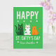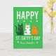 This greeting card features a bright emerald green background that sets a festive St. Patrick’s Day scene with a friendly, close-knit feel 💚. Three stylized cats sit in a neat row across the center, as if posing together for a shared moment. The left cat is deep forest green, the middle cat is white with two green polka dots, and the right cat is tangerine orange, all with wide yellow eyes and tiny open smiles showing a touch of pink. Their matching expressions and snug spacing make them look like loyal pals enjoying the day side by side ☘️. Near the top, “HAPPY” appears in white sans-serif letters, with small shamrocks tucked in as extra accents. Below the cats, “ST. CATTY’S DAY” is written in white and centered, keeping the joke front and center. Near the bottom, “Dear Brother” appears in white cursive-style lettering with little shamrocks on either side, all set against the flat green field.