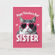 This greeting card shows a gray-and-white tabby cat facing forward against a rich fuchsia pink background. The cat wears oversized hot-pink heart-shaped sunglasses that cover its eyes, giving it a funny, confident look 🥰. Small pale-pink hearts float near both sides of the cat’s head, adding a gentle love theme without distracting from the face. Across the top, the text “Happy Valentine’s Day!” appears in curved white cursive lettering with a soft pink shadow. At the bottom, “SISTER” is written in large white all-caps letters with the same pink shadow, making it clear who the card is for. Details like the cat’s pink nose and bright white whiskers stand out against the smooth pink setting. It feels meaningful because it mixes affection with a little humor, like saying “I love you” in a way that can also make her smile ❤️.