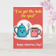 This Valentine’s Day card shows a teal teapot and a pink mug drawn like cute little characters, sitting together on a soft, white cloud shape. The teapot has a wide open smile and rosy cheeks, and black steam curls up from its spout as it leans toward the mug. The mug looks shy and sweet with a blush on its face, as if it’s flattered by the attention. The background is a flat, bright red that makes the teal and pink colors stand out clearly. At the top, the card says “I’ve got the hots for you!” in sunny yellow block letters, like a fun headline above the pair. Near the bottom, “Happy Valentine’s Day!” appears in rounded white letters that are easy to read and feel friendly. Altogether, it’s a simple, warm design that mixes a silly pun with real affection ❤️💌🍫. Hope it helps you share kind Valentine’s Day feelings with someone you care about.