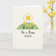 This card shows a sunny spring scene on a soft, creamy background, with a large round yellow sun filling the upper area and orange rays spreading outward. Below it sits a green half-circle hill, like a small meadow where five simple yellow flowers stand in a neat, balanced row 🌷. The shapes are smooth with a faint, grainy texture that makes the colors feel gentle and softly layered. The calm spacing and symmetry give the scene a quiet, caring mood, like something two close friends might linger over together. Centered beneath the illustration, the message reads “He is Risen ALLELUIA!” in a friendly hand-drawn look. The lettering is dark gray, standing out clearly without feeling harsh, and it sits with plenty of open space around it for an airy finish 🐰. The sun’s warm yellow circle and orange rays hover above the green mound and five yellow blooms, all arranged in simple, rounded forms.