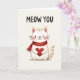 This card shows a chubby white cat centered on a soft off-white background, looking straight ahead as if locking eyes with someone it adores 🥰. A bright scarlet scarf is tied around its neck, with two little fringed ends that add a cozy, cuddly touch. The cat’s paws wrap around a large deep red heart held close to its chest, making the affectionate gesture the main focus ❤️. Its face is kept simple with tiny black dot eyes, a small brown nose, a gentle smile, and rosy pink cheeks that read like a shy blush. Light shading and faint outlines give the fur a soft, velvety look without adding heavy detail. Near the top, the phrase “MEOW YOU” sits above the cat in thick black hand-drawn letters, clearly standing out against the pale background. The palette stays mostly creamy whites and warm browns, letting the reds of the scarf and heart pop. The scarf’s knot and the heart’s rounded edges are drawn with smooth curves and minimal lines.